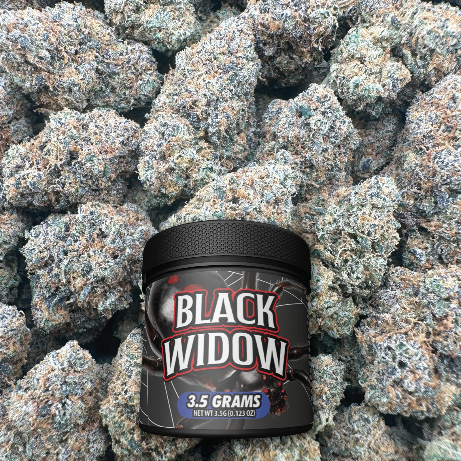 Black Widow is a bold, resin-rich strain with a deep, complex aroma that blends earthy spice, sweet woods, and a subtle creamy finish. The smoke is smooth and full-bodied, carrying that classic “dark” terp profile that seasoned smokers love. The buds are dense, frosty, and packed with potency, making this a standout pick in the mid-tier lineup.
