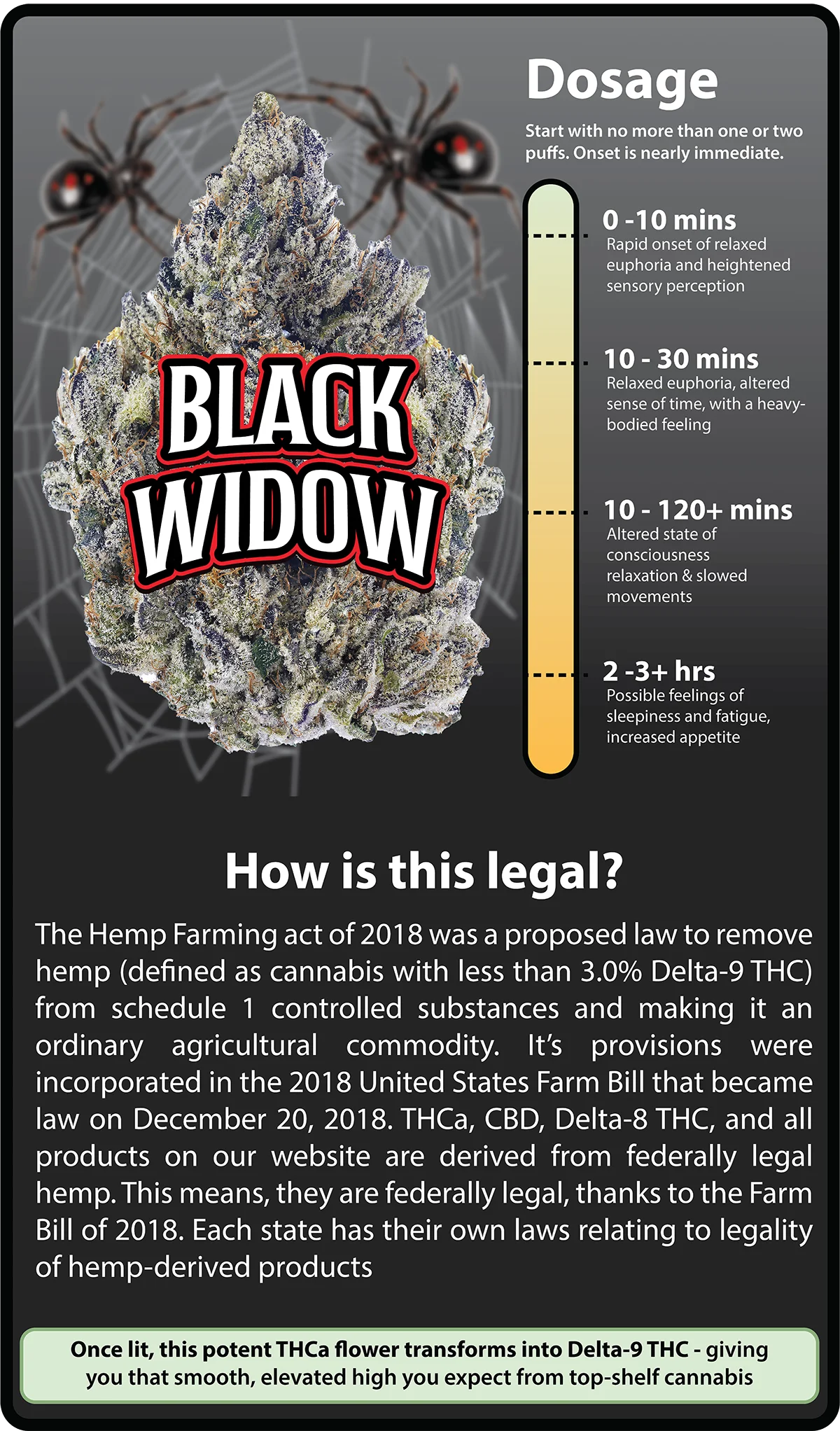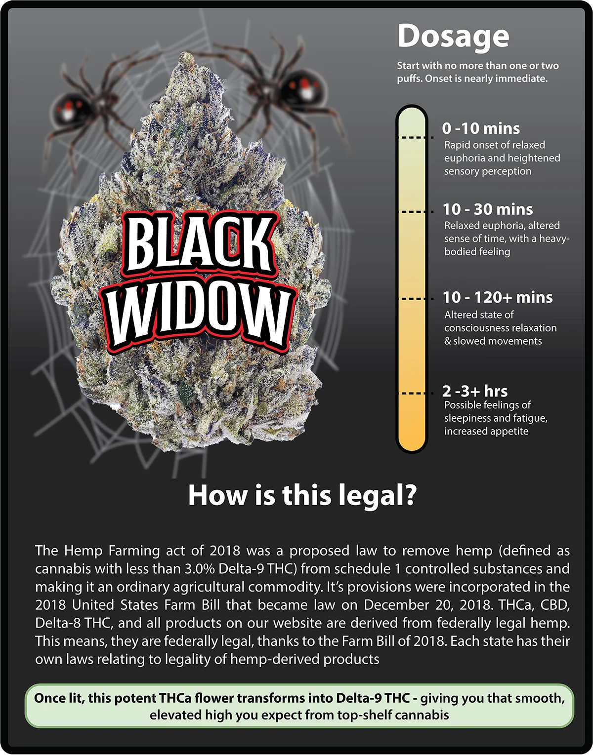 The high is powerful yet balanced — it starts with a cerebral spark that lifts your mood, then melts into warm body relaxation without feeling overwhelming. Black Widow is perfect for evening sessions, creative flow, or kicking back after a long day. It delivers premium flavor and potency at an unbeatable price.