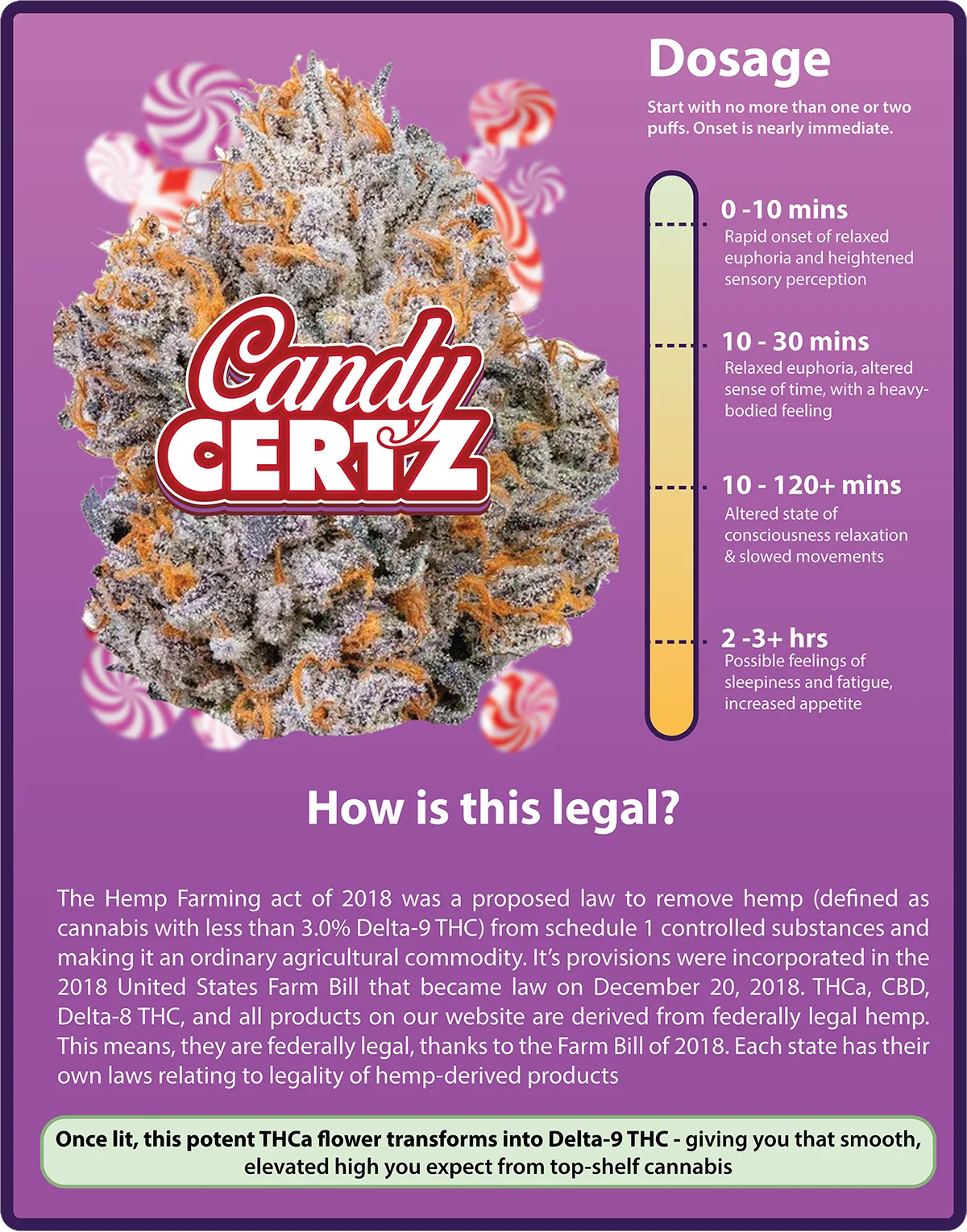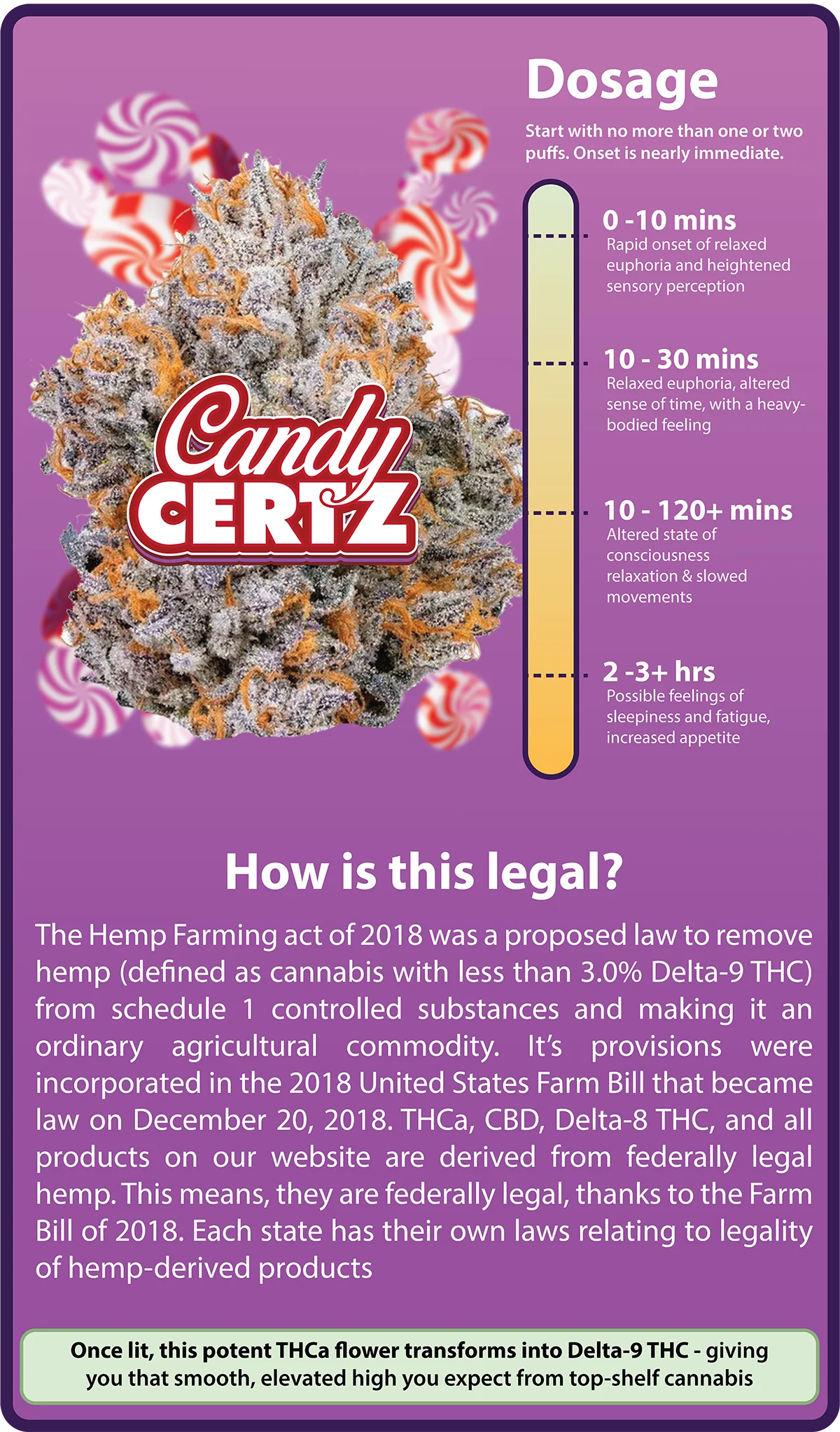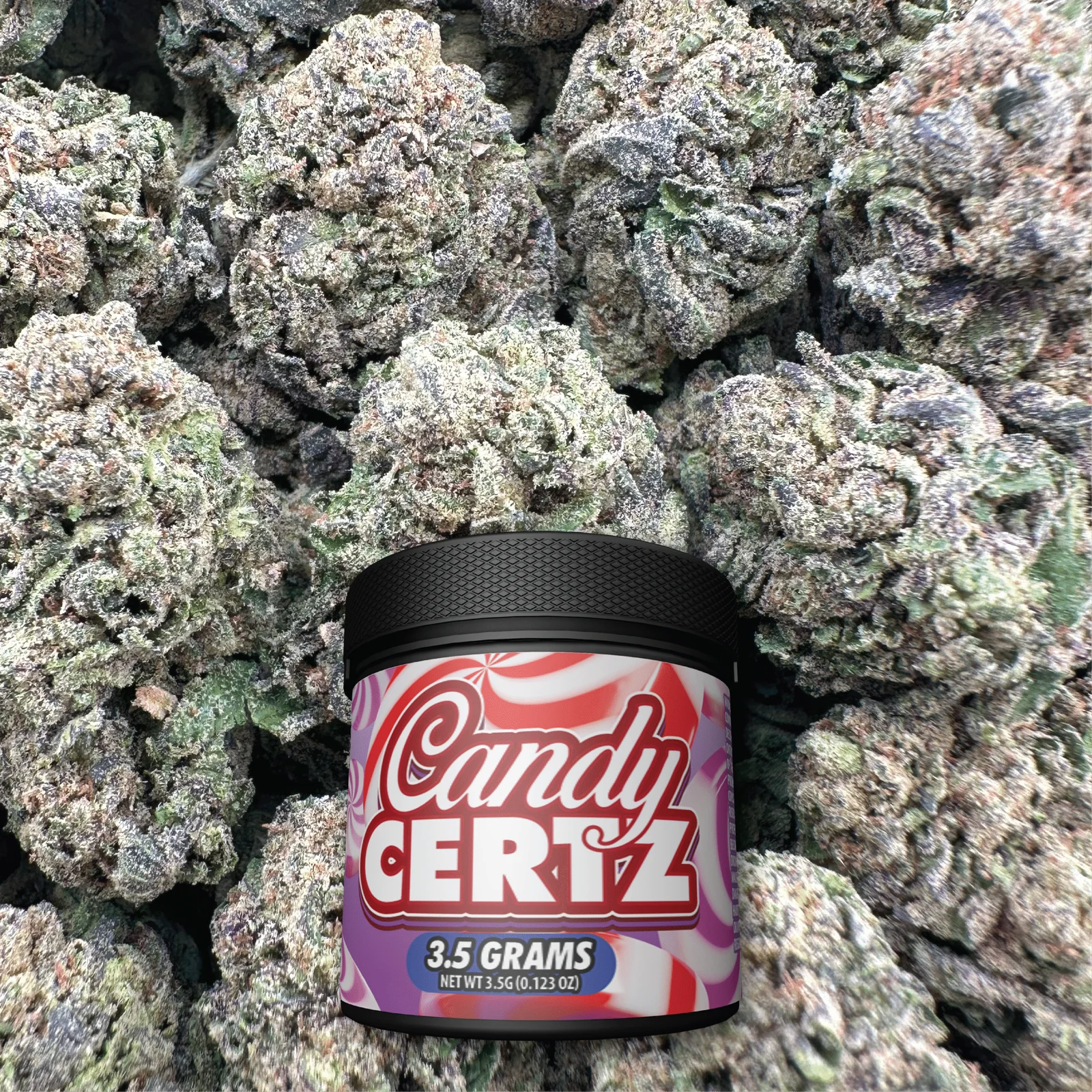 Candy Certz is sweet, fruity, and full of flavor — the kind of strain you smell from across the room. The buds are colorful and frosted, with that classic sugary candy terp profile.