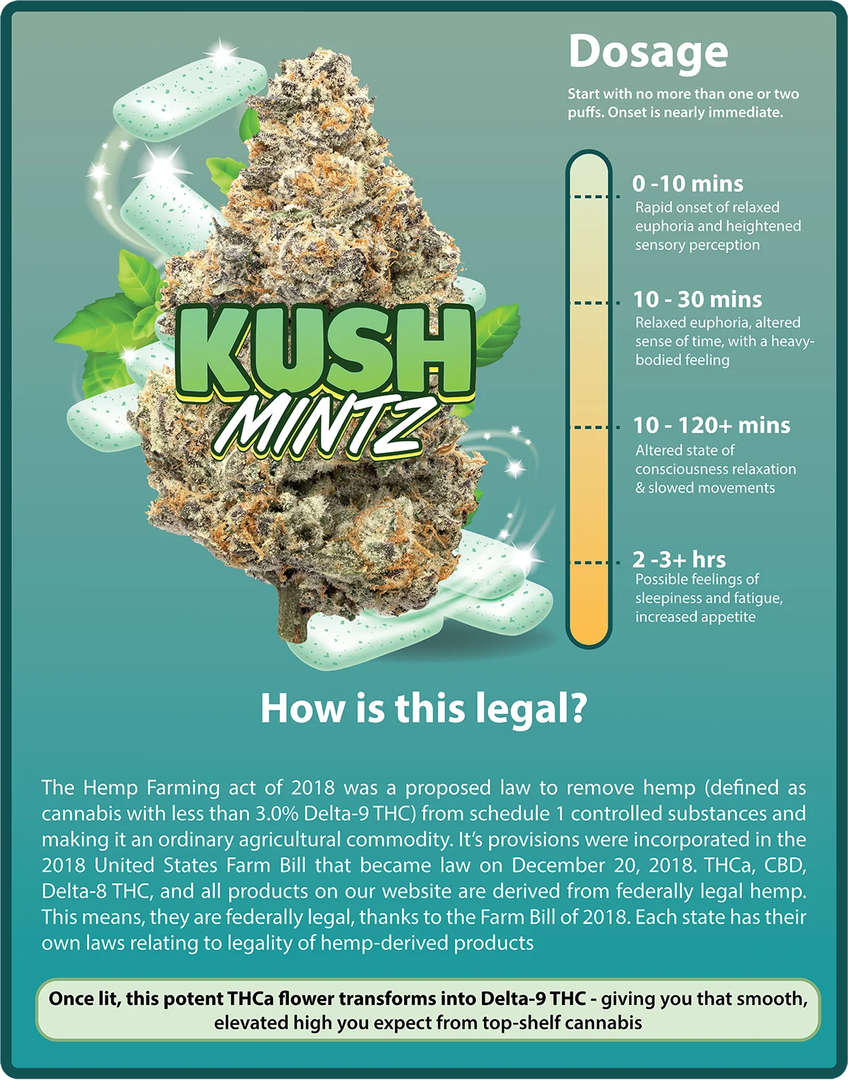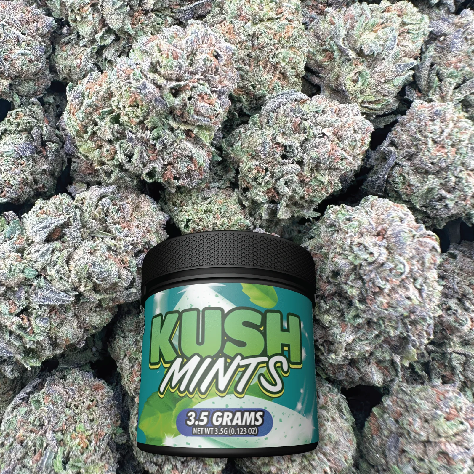 Kush Mintz blends cool mint terps with earthy kush undertones for a smooth, refreshing flavor. The buds are dense, sticky, and heavily frosted, giving it a premium appearance.