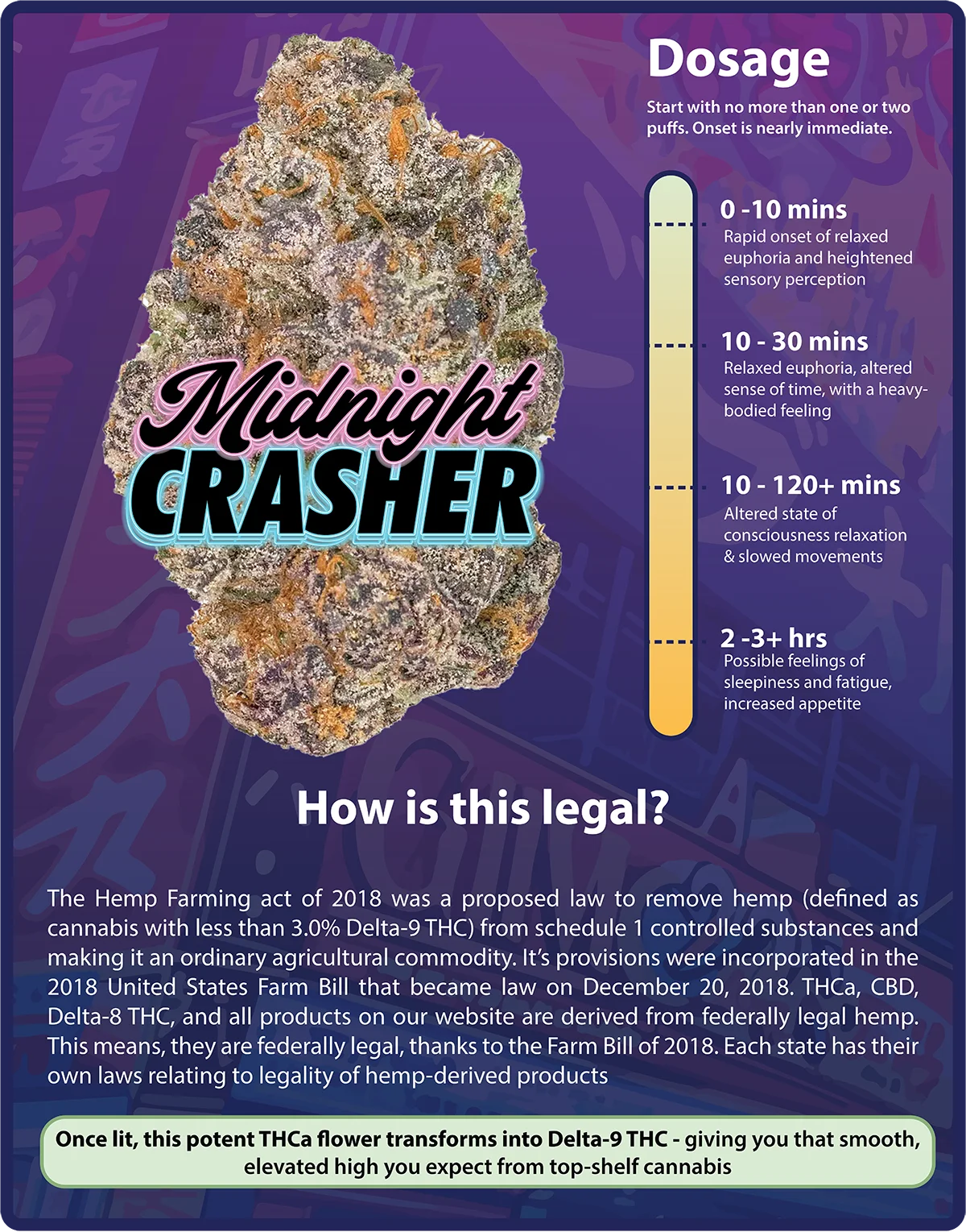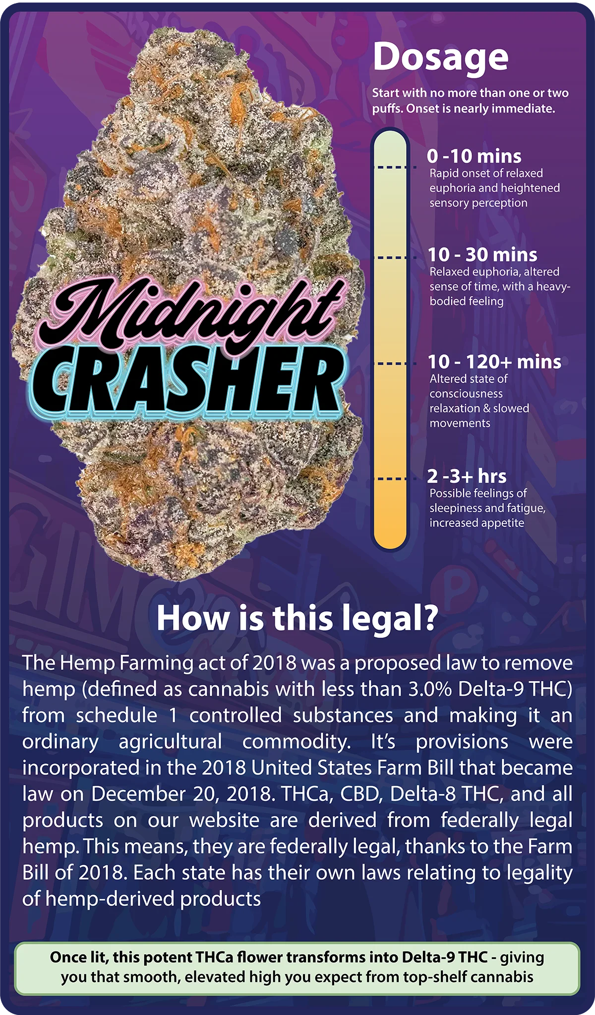Midnight Crasher blends sweet dessert terps with deep earthy tones for a bold and satisfying profile. The buds are chunky, frosty, and full of character. The flavor is smooth, rich, and slightly gassy on the exhale.