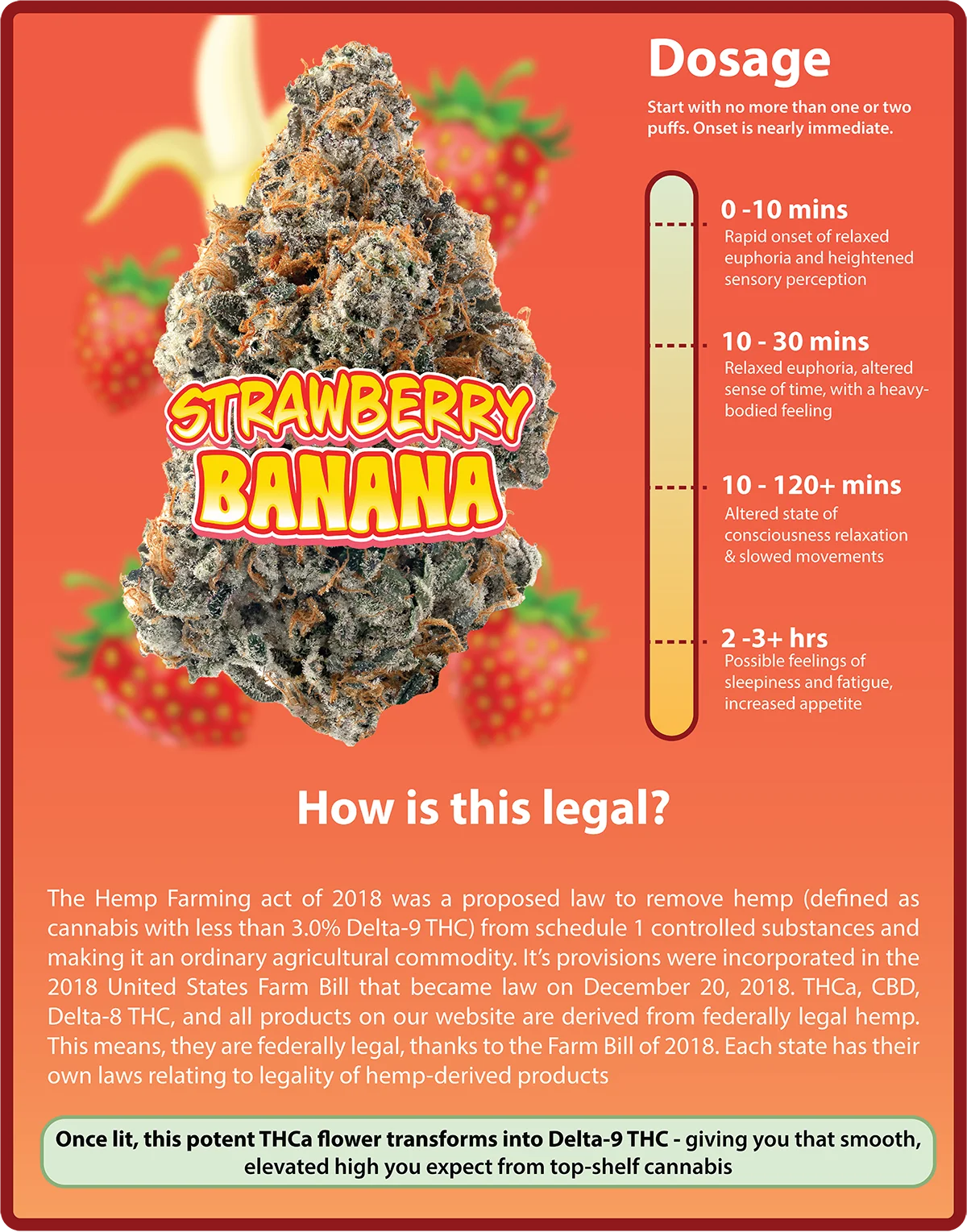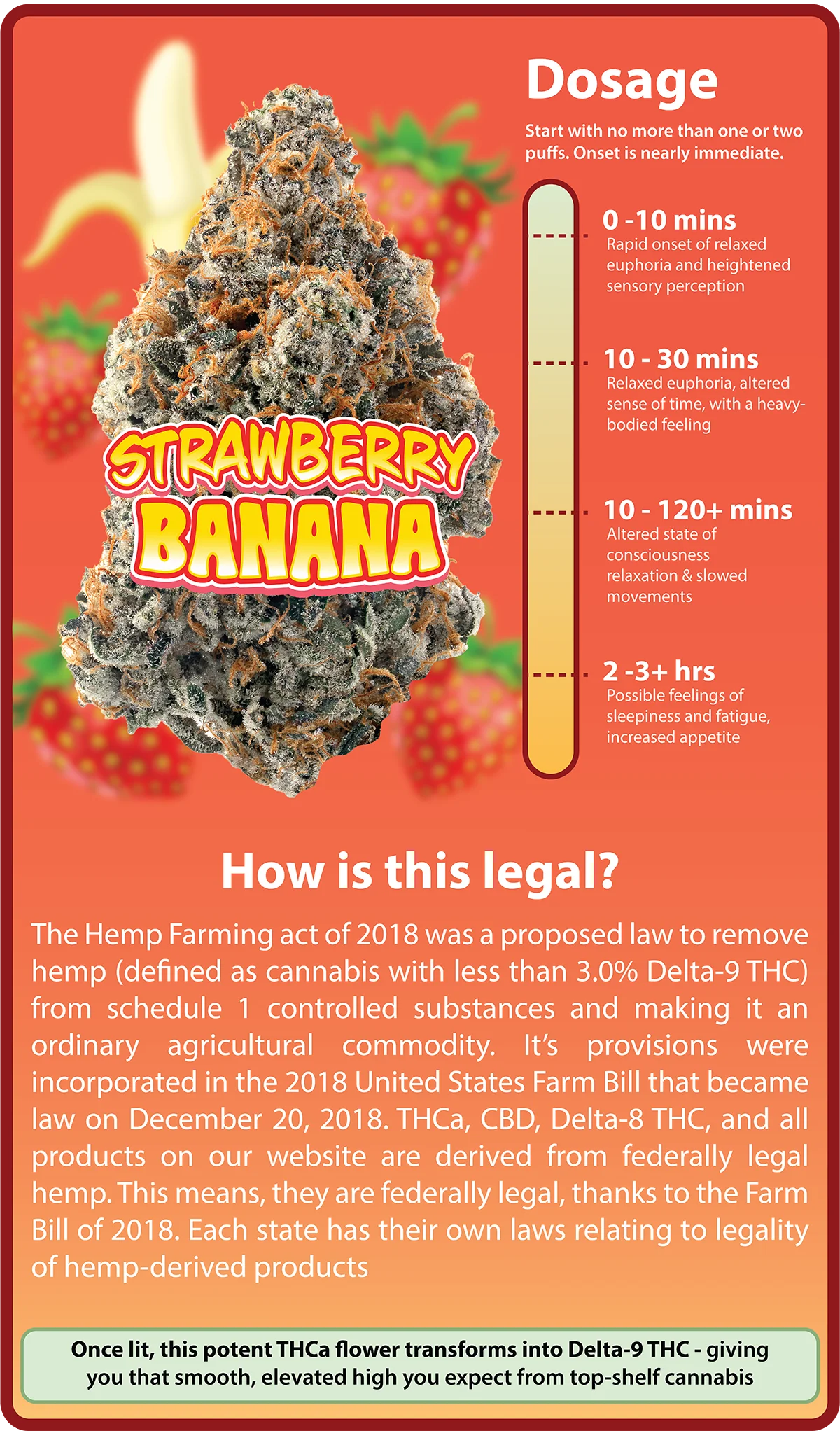 Strawberry Banana delivers an unmistakable fusion of sweet strawberry and ripe banana terps that fill the room instantly. The buds are thick, frosty, and sticky, showcasing its strong genetics. The smoke is creamy, fruity, and incredibly smooth, making it one of the easiest strains to enjoy.
